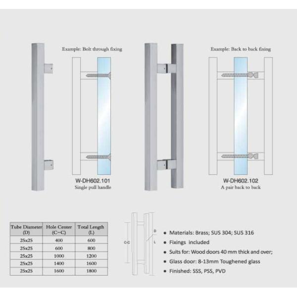 SUS304 Stainless Steel entry door handles set square tub H design W-DH602 glass door handle wooden door handles